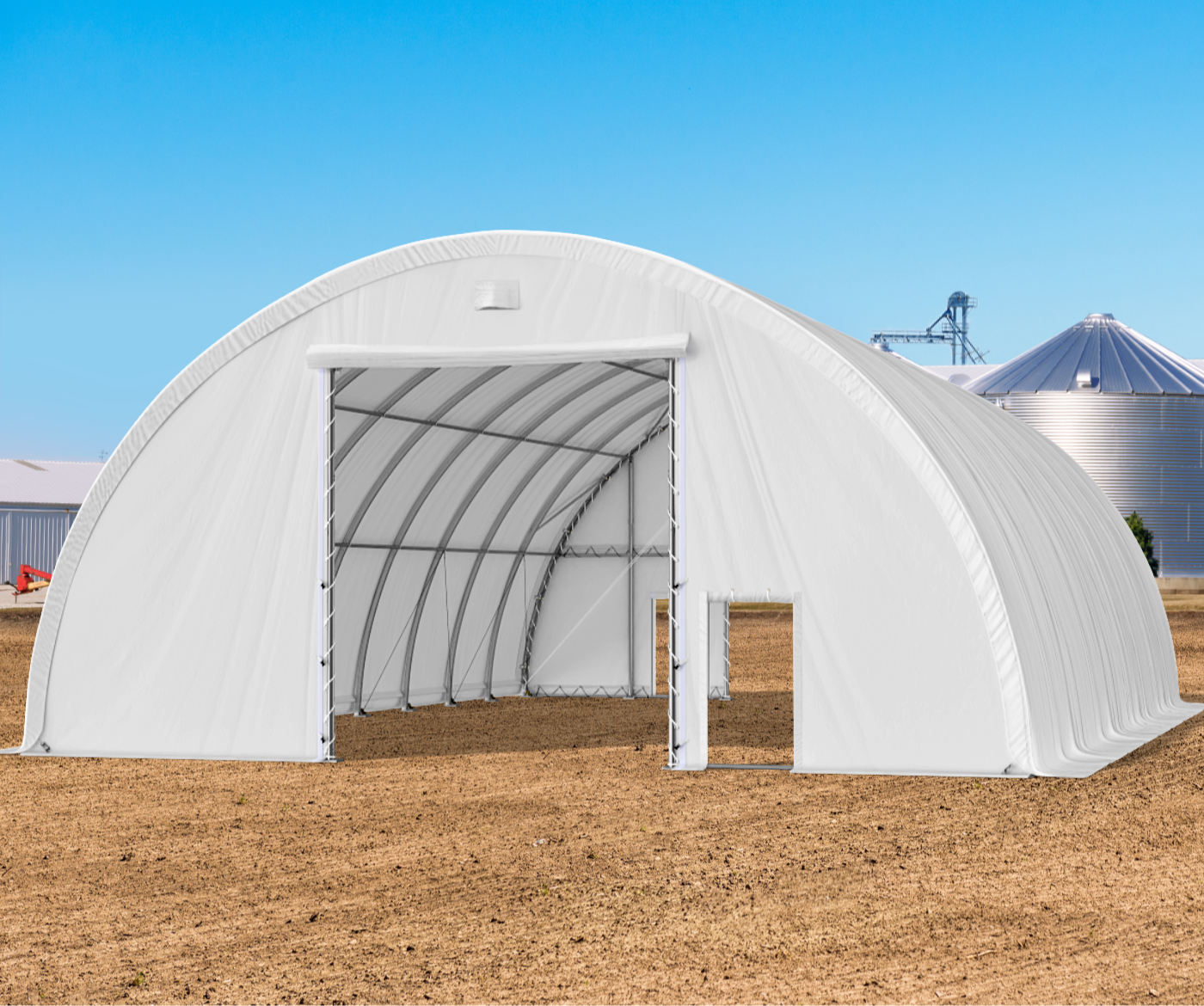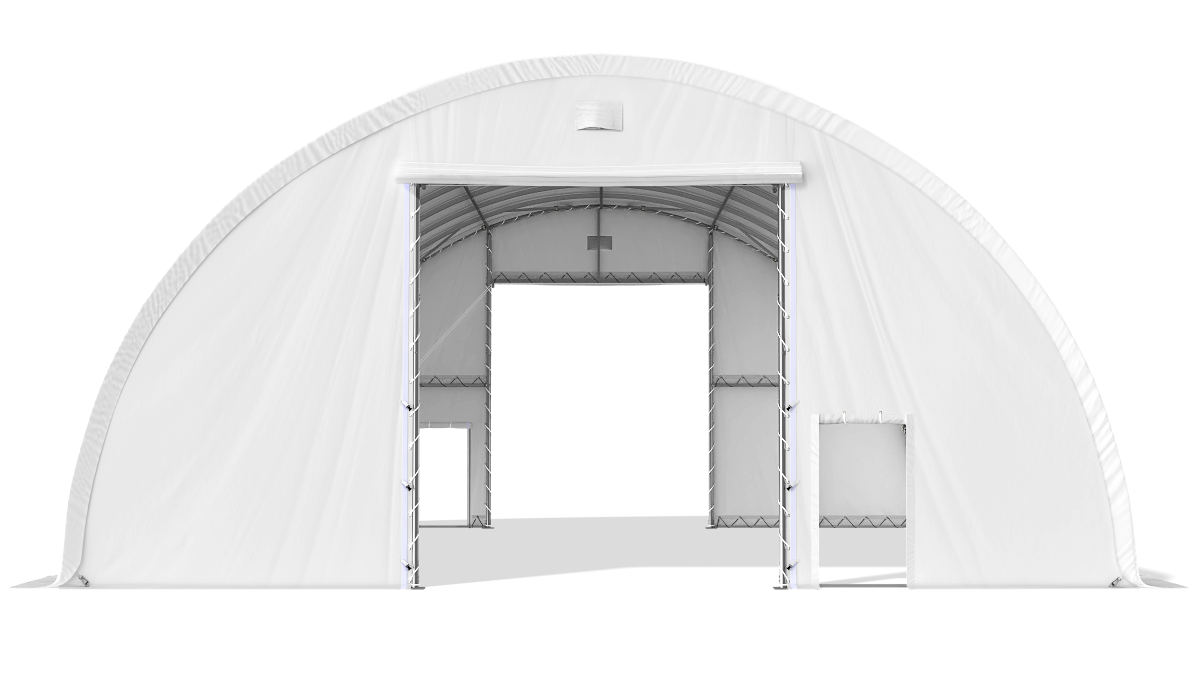 Białe poszycie hali łukowej wykonane z wytrzymałego PVC ok. 610 g/m², odporne jest na UV, deszcz oraz uszkodzenia. Posiada bramę główną o wymiarach 4,0 × 4,5 m. Boczne drzwi hali łukowej o wymiarach 1,0 × 2,0 m stanowią dodatkowe, małe wejście. Wewnętrzny system napinania odpowiada za równomierne rozciągnięcie plandeki, co zapobiega tworzeniu się nierówności i zastoisk wodnych. Zakres temperatur: od -15°C do 45°C. Takie rozwiązania sprawiają, że w hali łukowej w bezpieczny sposób można przechowywać maszyny, materiały budowlane, czy zboże.