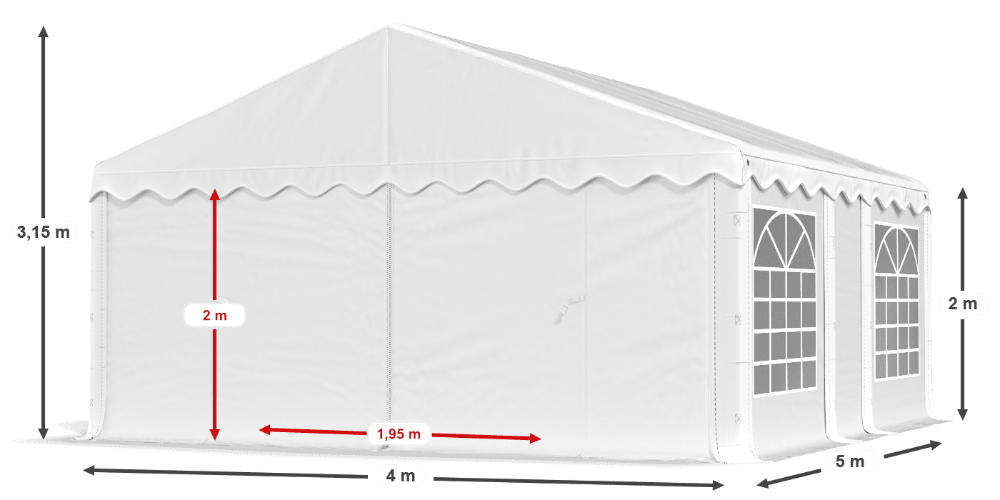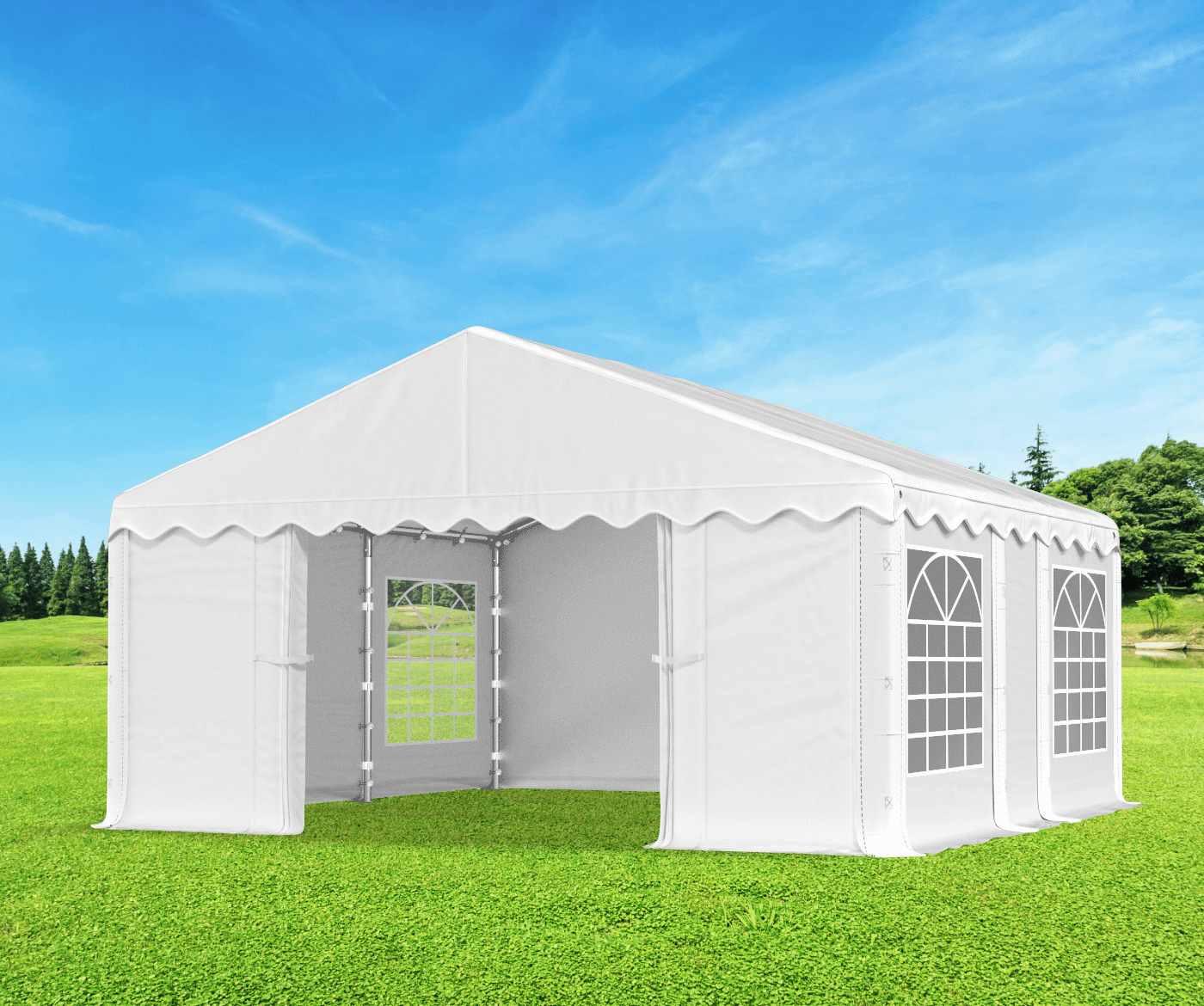 • Sezonowy namiot ogrodowy 4x5 m z wodoodporną plandeką z oknami witrażowymi. Namiot może także pełnić funkcję magazynu i składzika na meble i sprzęty ogrodowe. Namiotowa altana ogrodowa to także doskonały namiot eventowy, namiot handlowy i namiot cateringo