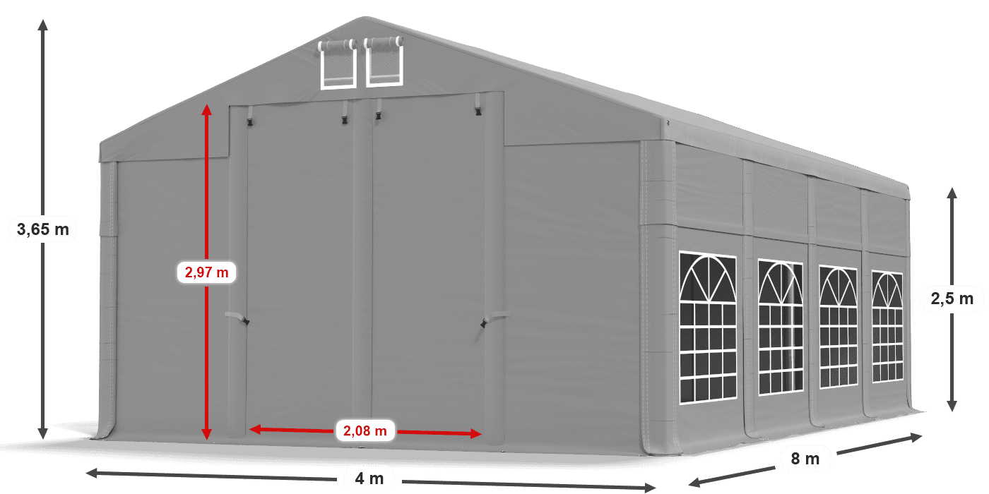 - Ściany boczne SD PVC ok. 2 x 2 m (polichlorek winylu) 500g/m2 - Okna witrażowe 140 x 130 cm