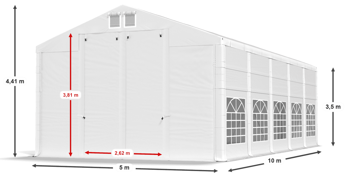 • Całoroczny namiot imprezowy 5x10 m z oknami witrażowymi. Namiot łatwo jest złożyć i przenieść – wzmocniona konstrukcja całoroczna o wysokości 3,5 m. Namiot doskonale sprawdzi się jako namiot ogrodowy, namiot handlowy i namiot cateringowy czy eventowy