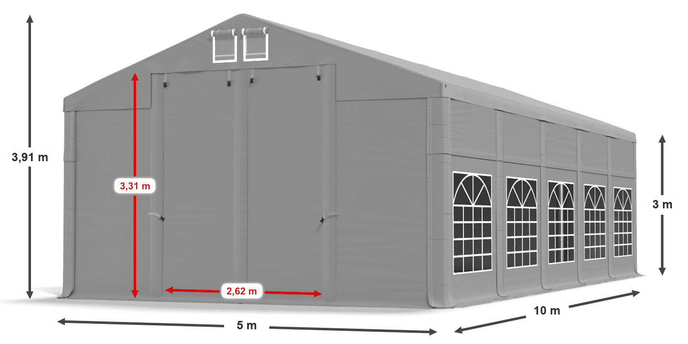 • Całoroczny namiot imprezowy 5x10 m z eleganckim poszyciem z oknami witrażowymi. Namiot łatwo jest złożyć i przenieść - konstrukcja o wysokości 3 m. Namiot doskonale sprawdzi się jako namiot ogrodowy, namiot handlowy i namiot cateringowy.