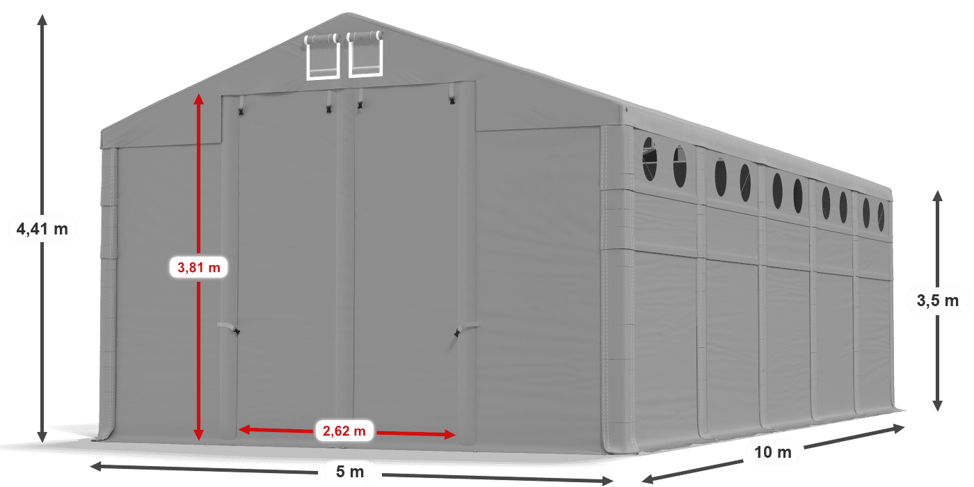 Całoroczny namiot przemysłowy Klasyk SD z okrągłymi oknami świetnie sprawdzi się jako przestrzeń warsztatowa, garażowa oraz myjnia. Okna o średnicy 39cm, umiejscowione w górnej części poszycia wpuszczają sporo dziennego światła, izolując jednocześnie zawartość wnętrza od wzroku osób postronnych. Poszycie wykonane z wodoodpornego PVC o większej gramaturze, chroni przed opadami, wiatrem i promieniowaniem UV.