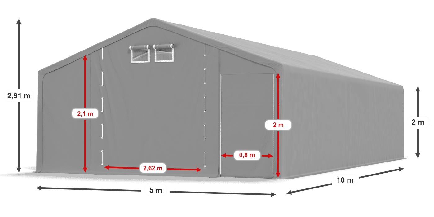 • Namiot magazynowy 5x10 m z pełną w kolorze szarym, ognioodporną plandeką. Wykorzystywany jest przez osoby prywatne i przedsiębiorstwa. Solidna, całoroczna i łatwa w montażu konstrukcja pozwala na rozłożenie namiotu na prawie każdym rodzaju podłoża. Odporn