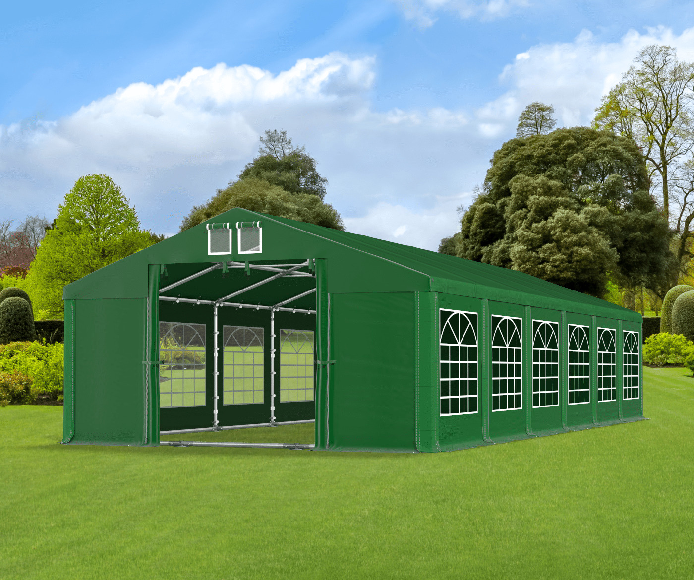 • Namiot imprezowy 5x12 m z poszyciem z oknami witrażowymi. W namiocie eventowym można zorganizować komunie, chrzciny, wesela i imprezy firmowe. Zadaszenie może być wykorzystywane jako altana ogrodowa, namiot gastronomiczny i namiot handlowy.