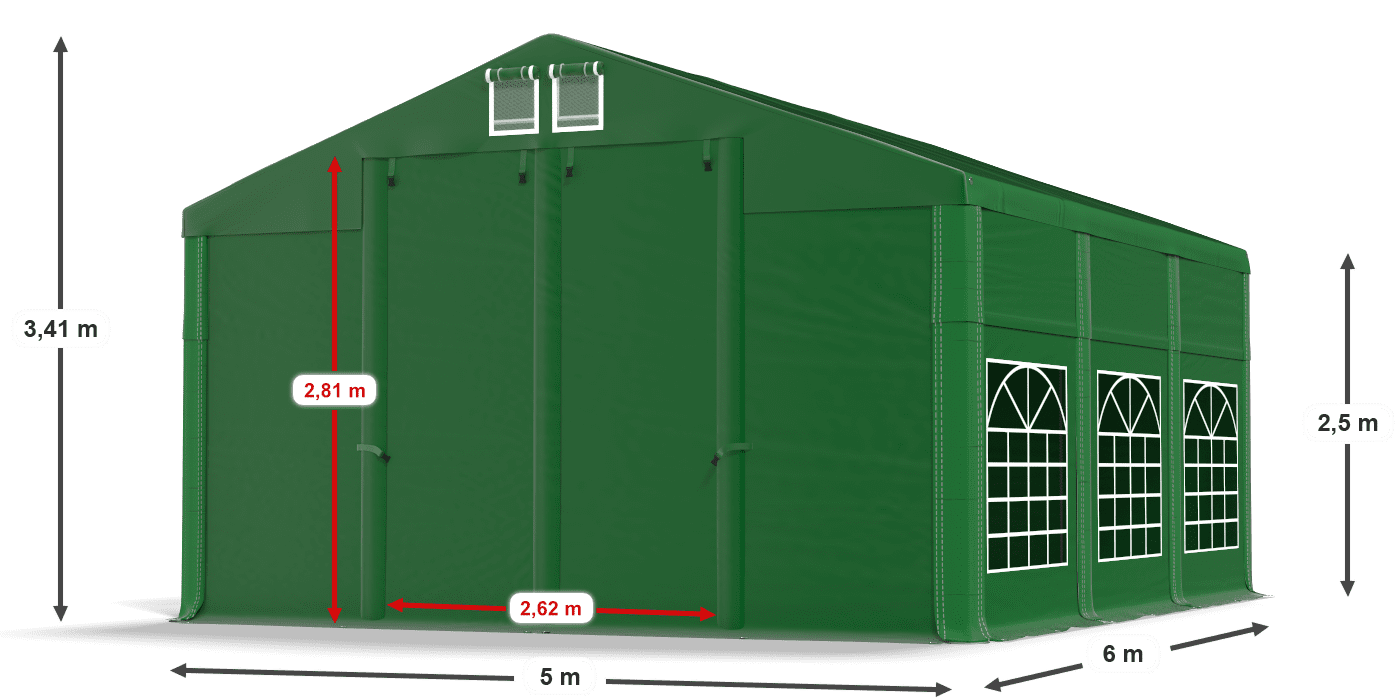 • Namiot imprezowy 5x6 m z plandeką z oknami witrażowymi. Całoroczna konstrukcja o wysokości 2,5m jest praktyczna i szybka w montażu. Namiot sprawdzi się także w roli namiotu ogrodowego, namiotu handlowego i namiotu cateringowego.
