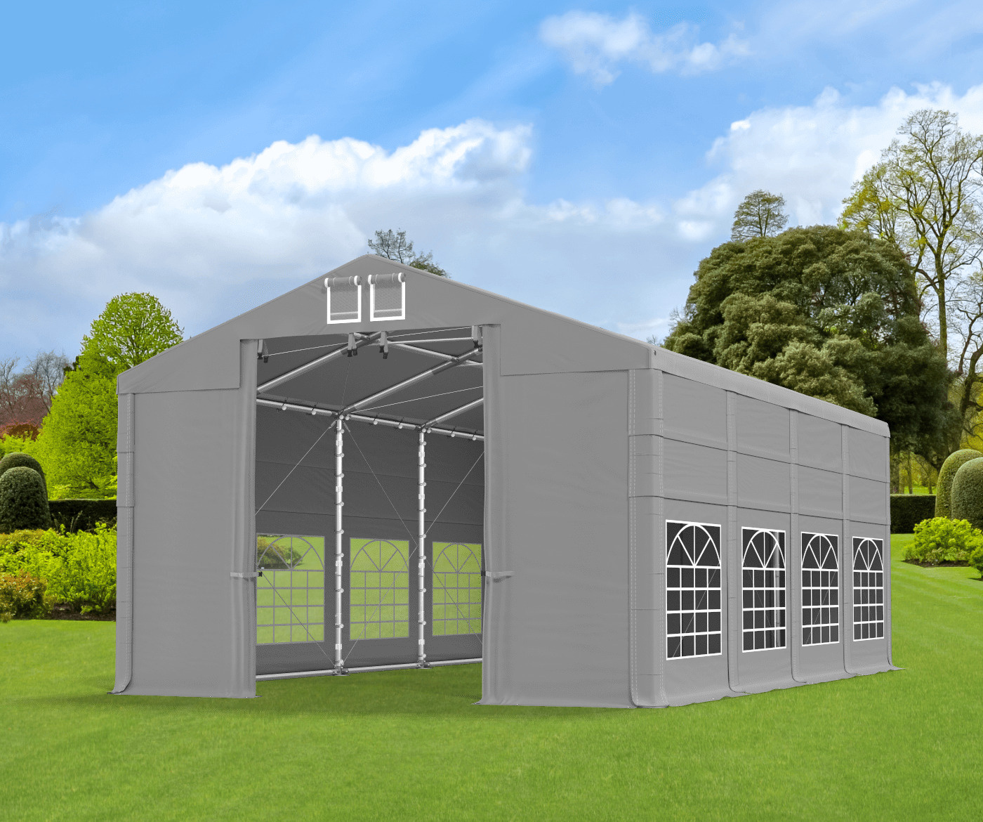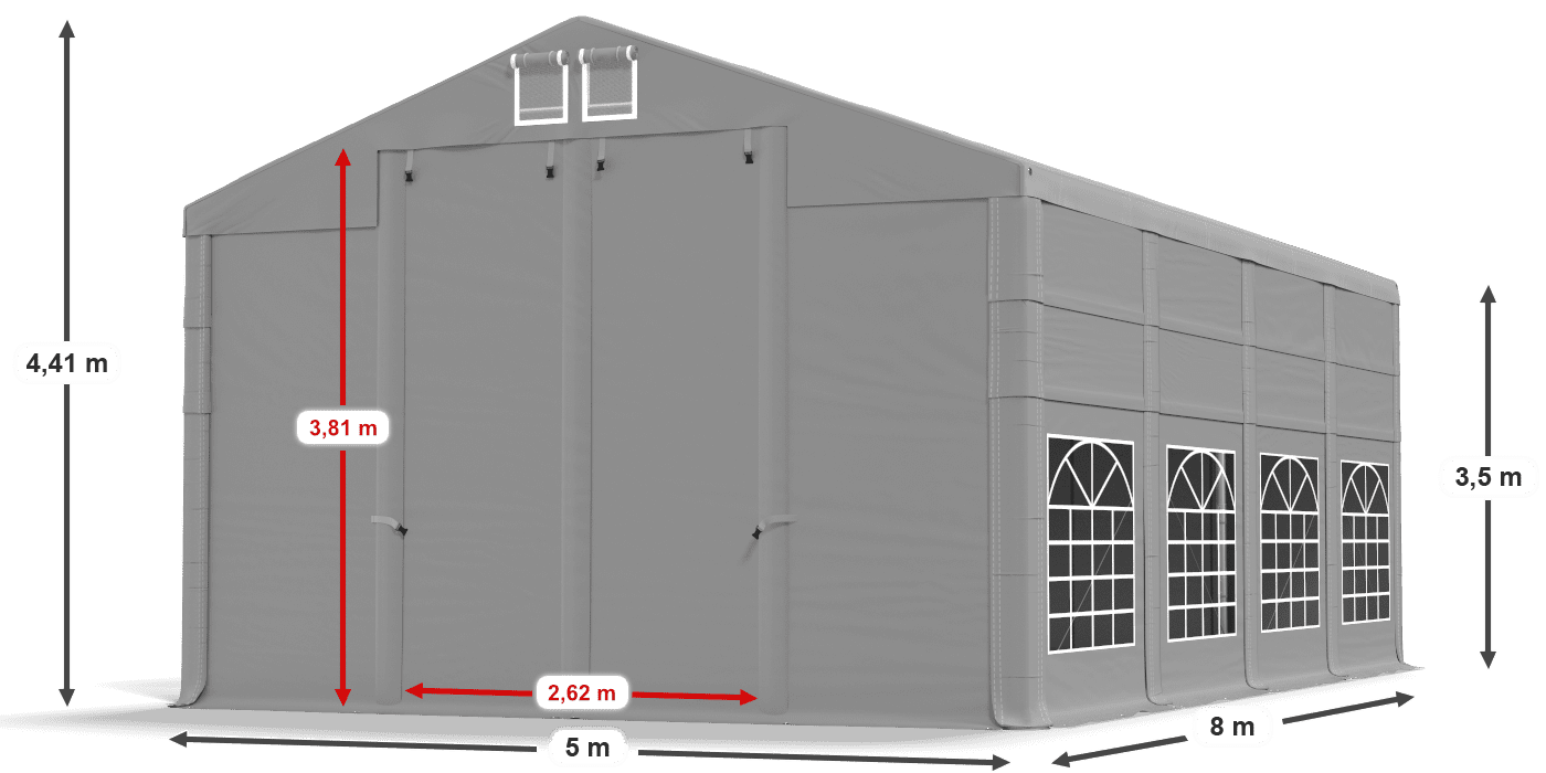 • Całoroczny namiot imprezowy 5x8 m z oknami witrażowymi. Namiot łatwo jest złożyć i przenieść – wzmocniona konstrukcja całoroczna o wysokości 3,5 m. Namiot doskonale sprawdzi się jako namiot ogrodowy, namiot handlowy i namiot cateringowy czy eventowy.
