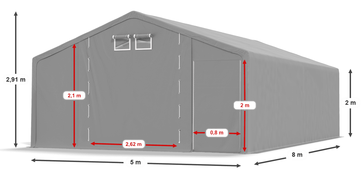 • Namiot magazynowy 5x8 m z pełną w kolorze szarym, ognioodporną plandeką. Wykorzystywany jest przez osoby prywatne i przedsiębiorstwa. Solidna, całoroczna i łatwa w montażu konstrukcja pozwala na rozłożenie namiotu na prawie każdym rodzaju podłoża. Odporne