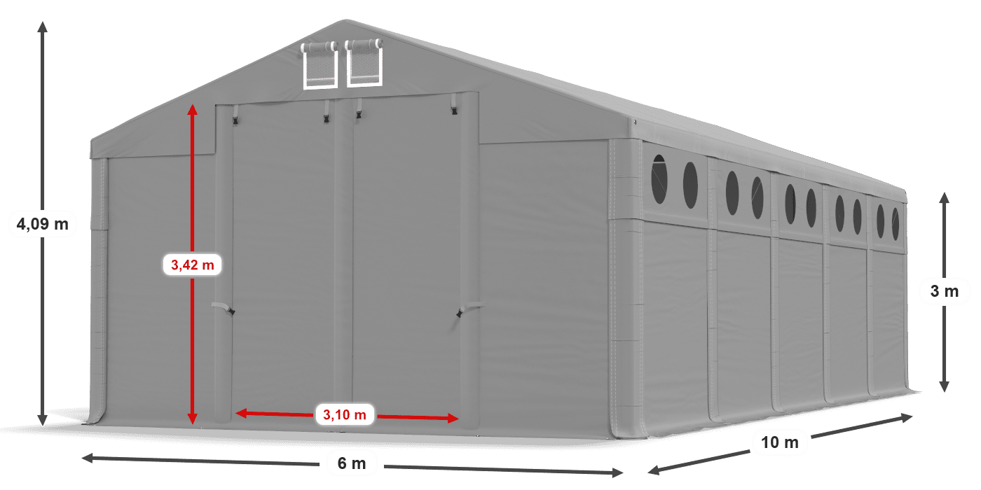 • Hala namiotowa magazynowa 6x10 m na całorocznej wzmocnionej konstrukcji z oknami doświetlającymi o wysokości 3 m. To doskonały wybór dla wszystkich, którym zależy na mobilnym, wielosezonowym magazynie. Plandeka wykonana z mocnego PVC jest wodoodporna i od