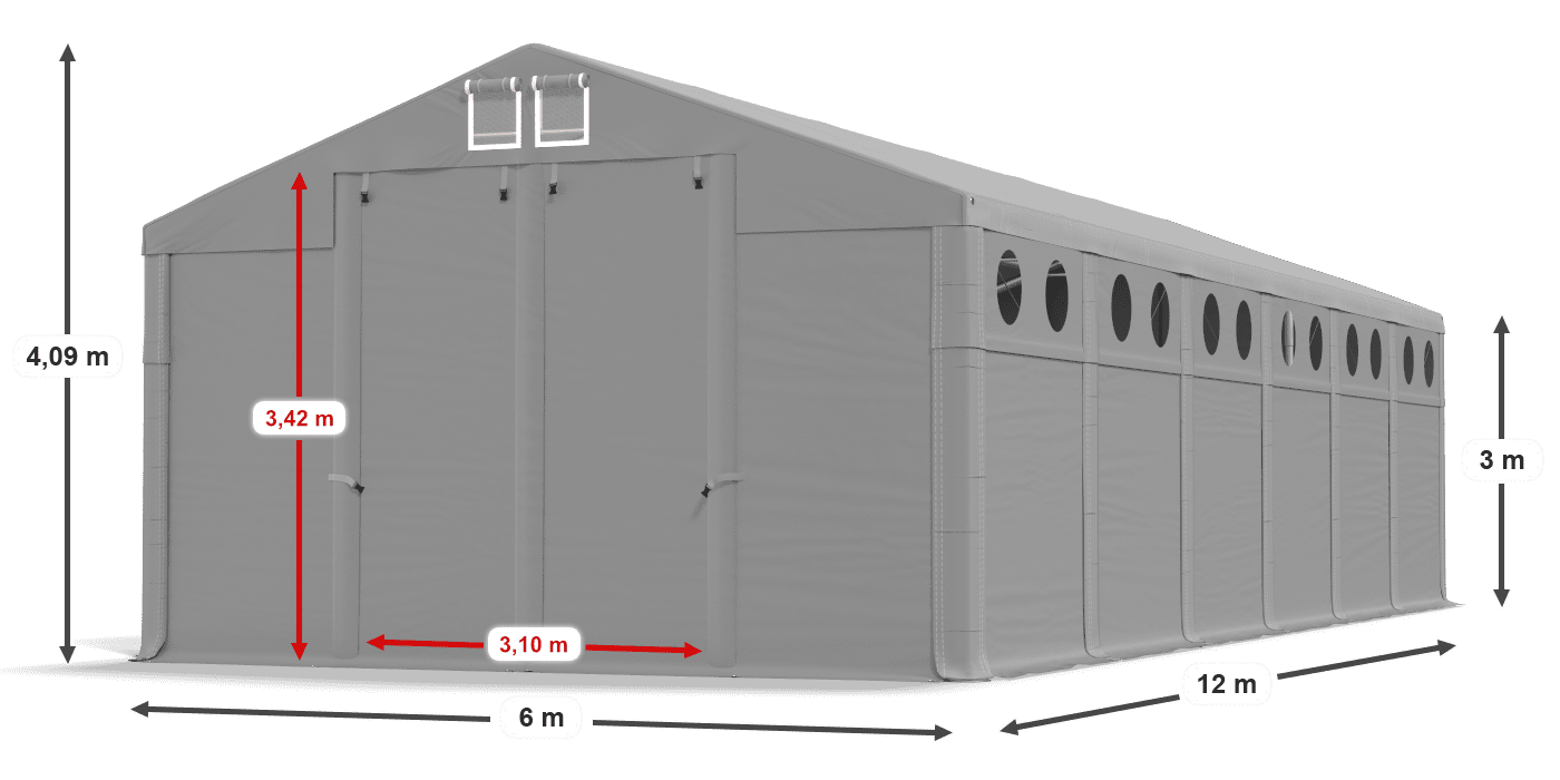 Całoroczny namiot przemysłowy Klasyk SD z okrągłymi oknami świetnie sprawdzi się jako przestrzeń warsztatowa, garażowa oraz myjnia. Okna o średnicy 39cm, umiejscowione w górnej części poszycia wpuszczają sporo dziennego światła, izolując jednocześnie zawartość wnętrza od wzroku osób postronnych. Poszycie wykonane z wodoodpornego PVC o większej gramaturze, chroni przed opadami, wiatrem i promieniowaniem UV.