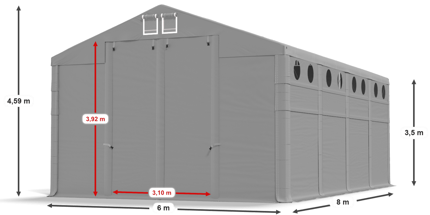 • Hala namiotowa magazynowa 6x8 m na całorocznej wzmocnionej konstrukcji z oknami doświetlającymi o wysokości 3,5 m. To doskonały wybór dla wszystkich, którym zależy na mobilnym, wielosezonowym magazynie. Plandeka wykonana z mocnego PVC jest wodoodporna i o