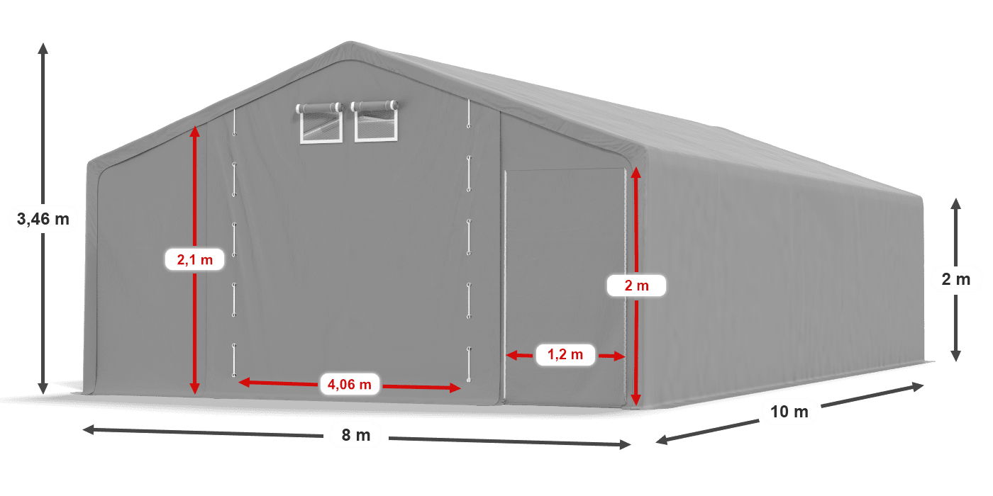 W halach namiotowych serii Premium - SFR poszycie zbudowane jest z trudnopalnego PVC. Dach i ściany boczne są integralną częścią. Dodatkowym udogodnieniem, które wprowadziliśmy w halach Halplan jest mniejsze wejście, które znajduje się obok dużej bramy wjazdowej. Dzięki zastosowaniu tego rozwiązania nie ma konieczności otwierania za każdym razem dużego wjazdu, kiedy chcemy wejść do wnętrza namiotu
