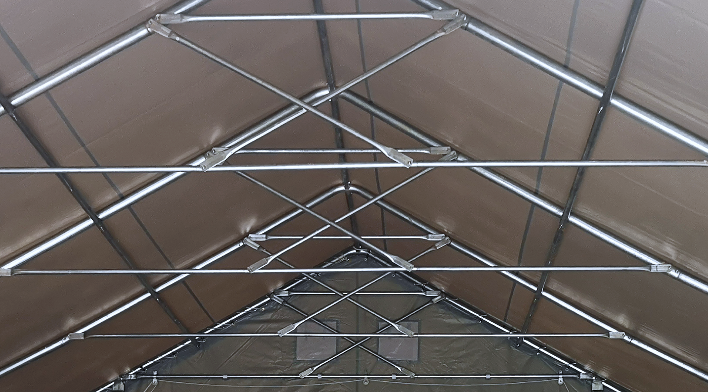 Konstrukcja Arctic jest zgodna tylko z poszyciem serii Arctic. To bardzo solidna i odporna konstrukcja, która znajdzie swoje zastosowanie zarówno w przemyśle, jak i rolnictwie. Wykorzystaliśmy w niej rury fi 78 mm i łączniki o tej samej średnicy. W celu stabilizacji całego namiotu wykorzystaliśmy dodatkowe wzmocnienia na bokach oraz podwójne zastrzały przy dachu. Stopy narożne mają wymiary 30 cm x 40 cm, a pozostałe 30 cm x 30 cm. Konstrukcja