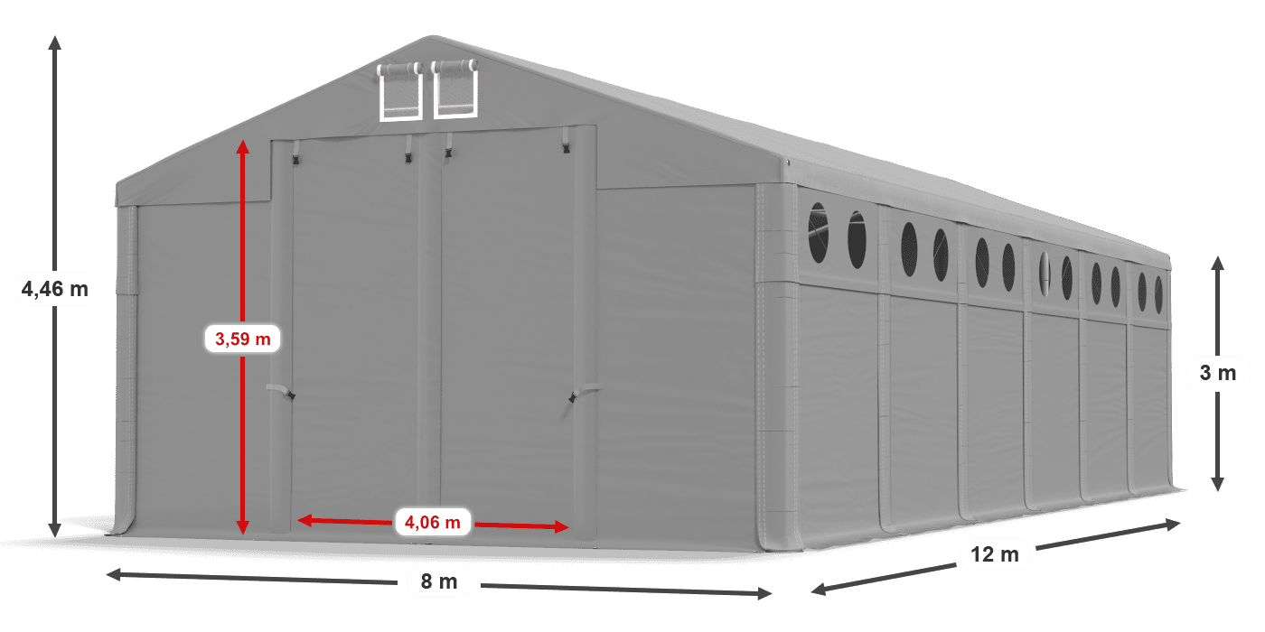 • Hala namiotowa magazynowa 8x12 m na całorocznej wzmocnionej konstrukcji z oknami doświetlającymi o wysokości 3 m. To doskonały wybór dla wszystkich, którym zależy na mobilnym, wielosezonowym magazynie. Plandeka wykonana z mocnego PVC jest wodoodporna i od