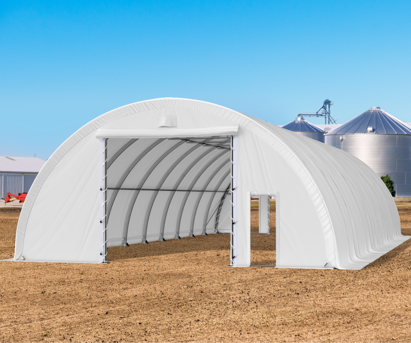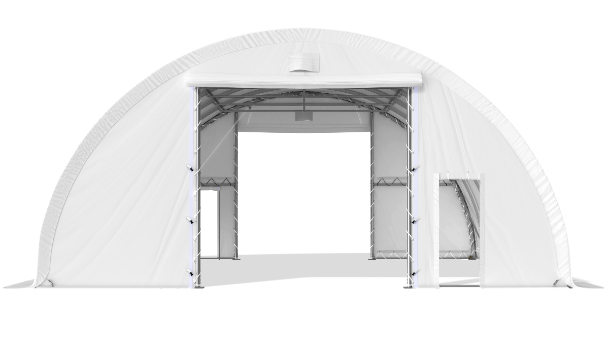 Białe poszycie hali łukowej wykonane z wytrzymałego PVC ok. 610 g/m², odporne jest na UV, deszcz oraz uszkodzenia.