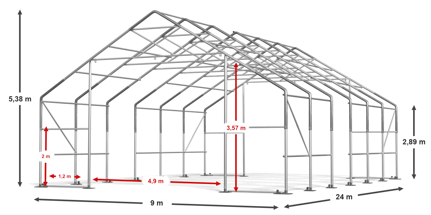Konstrukcja Arctic jest zgodna tylko z poszyciem serii Arctic. To bardzo solidna i odporna konstrukcja, która znajdzie swoje zastosowanie zarówno w przemyśle, jak i rolnictwie. Wykorzystaliśmy w niej rury fi 78 mm i łączniki o tej samej średnicy. W celu stabilizacji całego namiotu wykorzystaliśmy dodatkowe wzmocnienia na bokach oraz podwójne zastrzały przy dachu. Stopy narożne mają wymiary 30 cm x 40 cm, a pozostałe 30 cm x 30 cm.