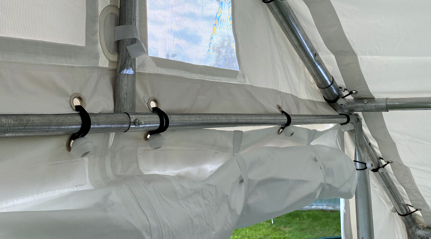 W celu zagwarantowania swobodnego wjazdu i wyjazdu pojazdu zdecydowaliśmy się na usunięcie rur w dolnej części konstrukcji namiotu. To bardzo funkcjonalne rozwiązanie, które dodatkowo wyposażyliśmy w pionowe rury usztywniające namiot.