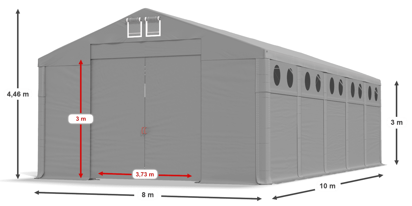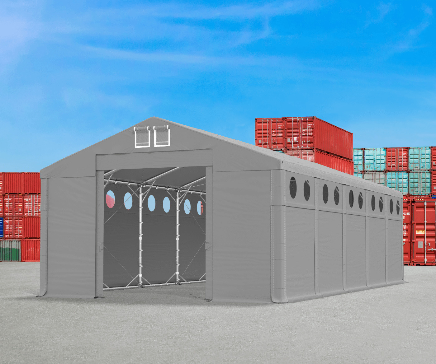 • Odporna hala namiotowa 8x10 m na całorocznym stelażu o wysokości 3 m. Wzmocniona konstrukcja wykonana ze stali została zabezpieczona przed korozją. Hala namiotowa jest mobilna i można przenieść ją w inne miejsce w dowolnym momencie. Mocne poszycie z PVC j